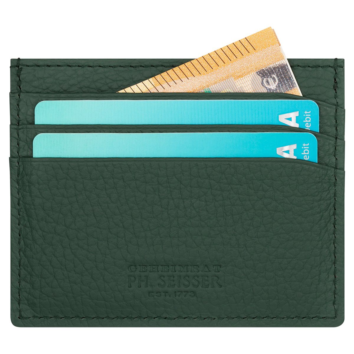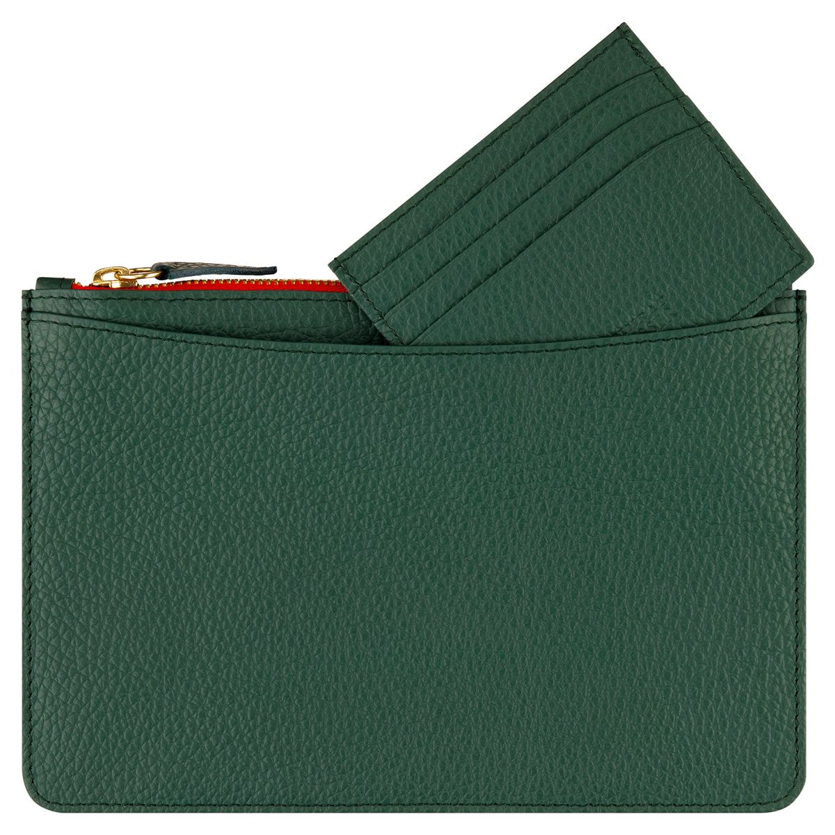 Erhältlich ist das ROMA-Set in Jagdgrün (französisches Rindsleder) oder Cognac (deutsches Hirschleder). Innen ist die Tasche mit echtem Veloursleder gefüttert, außen ergänzt eine geschwungene Tickettasche das elegante Design. Der Messing-Reißverschluss ist an den Enden mit Lederbändern eingefasst. Das passende Kredit- und Schein-Etui bietet sechs (3/3) abgerundete Kartenfächer und ist rot mit feiner Viskose und Schweinsvelours gefüttert – ein edler Kontrast zum Außenleder.